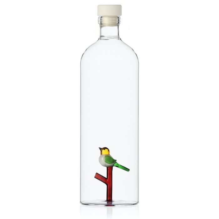 Deze transparante waterfles van borosilicaatglas uit de collectie Animal Farm van Ichendorf Milano is ontworpen door de Italiaanse ontwerpster Alessandra Baldereschi en voorzien van vogeltje zittend op een tak.