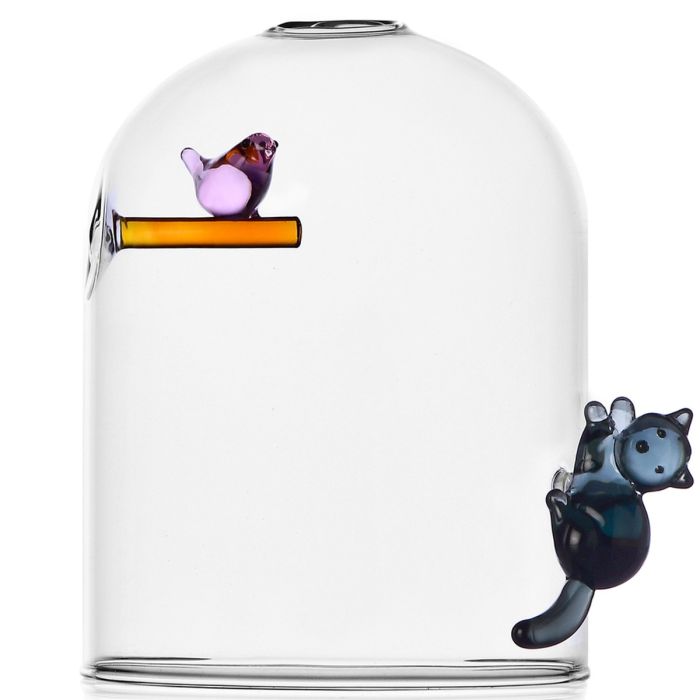 Deze bijzondere windlichte glazen kandelaar (waxinelichtje) met vogel en kat behoort tot de Ichendorf Milano ‘Birds’ collectie en is speciaal ontworpen door Japanse ontwerpster Tomoko Mizu.