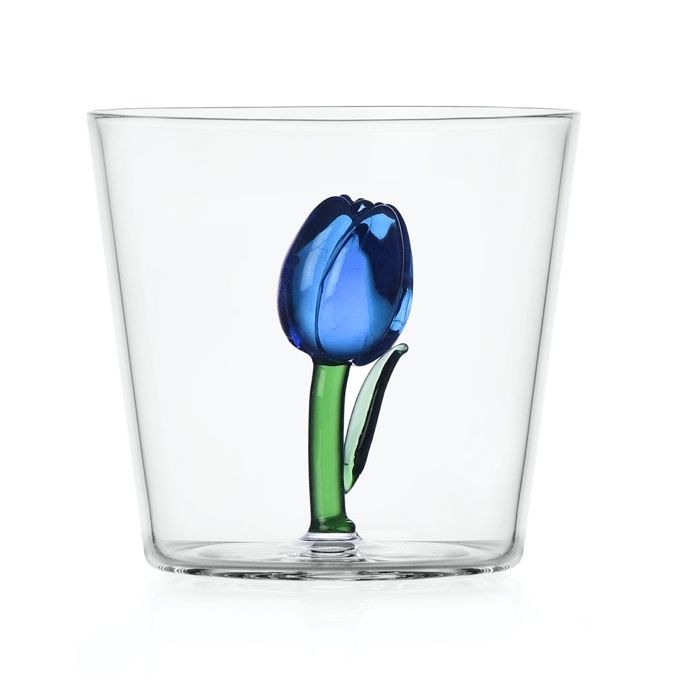 Ichendorf Milano weet al sinds het begin van de 20e eeuw ambacht en modern design te verenigen. Sinds de vestiging in Milaan in de jaren negentig, is het merk wereldwijd geliefd om zijn speelse maar elegante glaswerken. Dit waterglas met blauwe tulp is niet alleen praktisch voor dagelijks gebruik, maar ook een klein kunstwerk dat elke tafelsetting een frisse, bloemrijke uitstraling geeft.