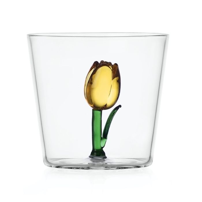 Ichendorf Milano weet al sinds het begin van de 20e eeuw ambacht en modern design te verenigen. Sinds de vestiging in Milaan in de jaren negentig, is het merk wereldwijd geliefd om zijn speelse maar elegante glaswerken. Dit waterglas met gele tulp is niet alleen praktisch voor dagelijks gebruik, maar ook een klein kunstwerk dat elke tafelsetting een frisse, bloemrijke uitstraling geeft.