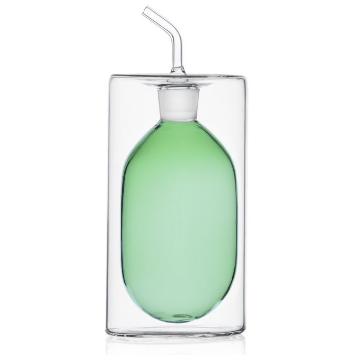 Ichendorf Milano 'Cilindro Colore' dubbelwandige olie- en/of azijnfles (250 ml) van helder en transparant glas aan de buitenzijde en met groengekleurd glas aan binnenkant. Gevuld geeft deze fles een bijzonder effect door de dubbelwandige uitvoering. Eigentijds fijn Italiaans glaswerk gemaakt van duurzaam borosilicaatglas. Ontwerper: Corrado Dotti