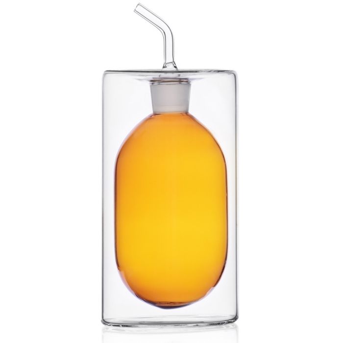 Ichendorf Milano 'Cilindro Colore' dubbelwandige olie- en/of azijnfles (250 ml) van helder en transparant glas aan de buitenzijde en met okergeel glas aan binnenkant. Gevuld geeft deze fles een bijzonder effect door de dubbelwandige uitvoering. Eigentijds fijn Italiaans glaswerk gemaakt van duurzaam borosilicaatglas. Ontwerper: Corrado Dotti