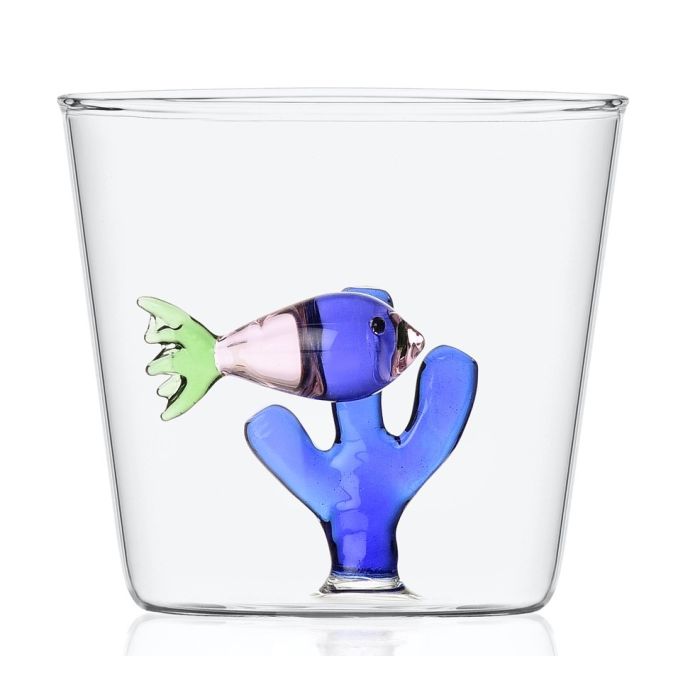 Dit waterglas van borosilicaatglas uit de collectie Marine Garden is ontworpen door de Italiaanse ontwerpster Alessandra Baldereschi en voorzien van een roze vis met blauw zeewier.