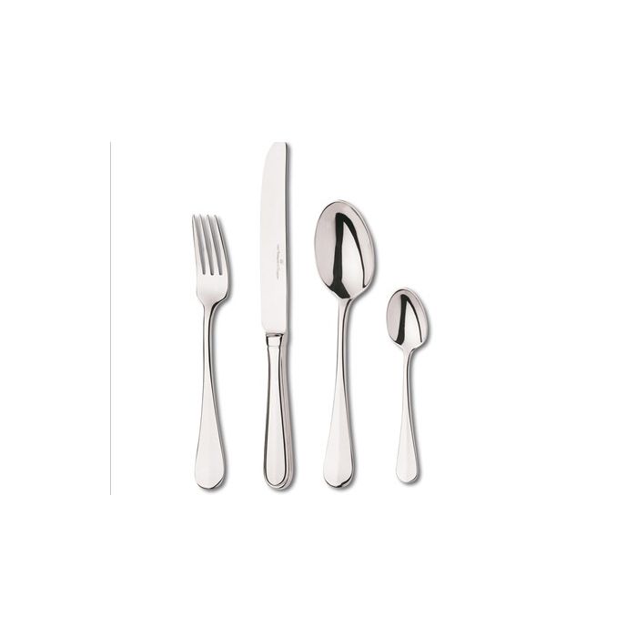 9 tafellepels, 9 tafelvorken, 9 tafelmessen, 9 dessertlepels, 9 dessertvorken, 9 dessertmessen, 9 koffielepels, 9 taartvorkjes, 9 theelepels, 1 aardappellepel, 2 groentelepels,1 sauslepel, 1 saladecouvert (2 delig), 2 botermesjes en 1 taartschep.