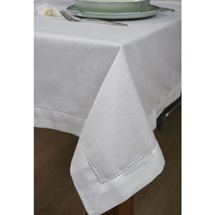 Gezellig tafelen begint bij een mooi gedekte tafel. Met dit witte gemêleerde tafelkleed van KOOK met een Italiaanse ajour rand, heb je altijd een perfect gedekte tafel.