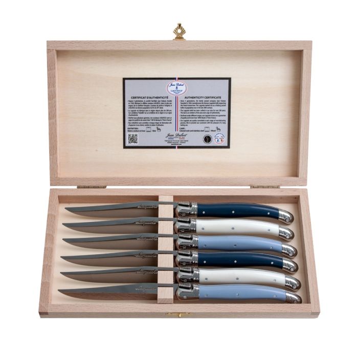 Deze set met 6 steakmessen van 'premium' kwaliteit, wordt gemaakt in het honderd jaar oude Franse familiebedrijf Jean Dubost. De vlijmscherpe, stijlvolle en solide messen liggen erg goed in de hand en hebben een staaldikte van 2,5 mm. Het heft is gemaakt van acrylaat (PMMA) een sterke kunststof. Het roestvrijstalen steakmes lemmet is glad geslepen en uitstekend geschikt voor het snijden van steaks, lamsvlees, barbecue gerechten, wild en rollades. De set is volledig geproduceerd in Frankrijk en voorzien van een echtheidscertificaat. De set wordt in een mooi afgewerkte afsluitbare houten bestekkist van Europees populierenhout geleverd. De mooi uitgevoerde bestekkist is niet alleen een luxe cadeauverpakking maar ook zeer geschikt om het bestek in op te bergen.