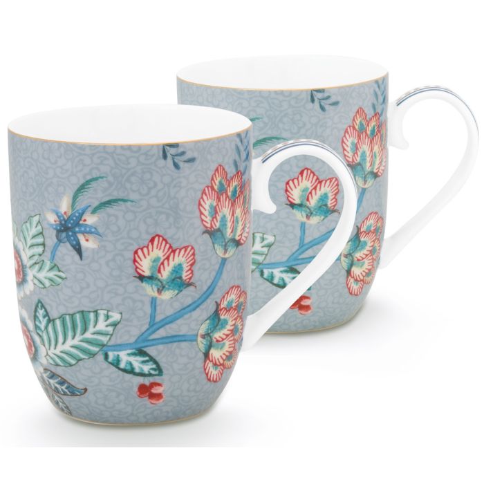 Vul je servies aan met deze Flower Festival set van twee kleine mokken. Deze 2 kleine mokken hebben een blauwe achtergrond en zijn versierd met het elegante Flower Festival dessin. Dit rijke bloemendessin is opgebouwd uit een variatie van fantasierijke rode en roze chintzbloemen met lichtblauwe en groene bladeren. De speels geplaatste bloementakjes met uitgewerkte gedecoreerde bloemen en bladeren geven dit verfijnde dessin een extra rijke beleving. Met ons Flower Festival porselein zul je jouw servieskast en tafel laten stralen.