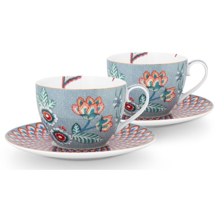 Pip Studio Flower Festival Cappuccinokop 280ml en schotel Light Blue - Set van 2