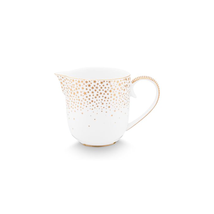 Deze feestelijke melk kan is gedecoreerd met het Royal Winter White dessin, perfect om je servies collectie klaar te maken voor de feestdagen. De kan is versierd met verschillende maten sterren en het handvat van is versierd met gouden strepen.