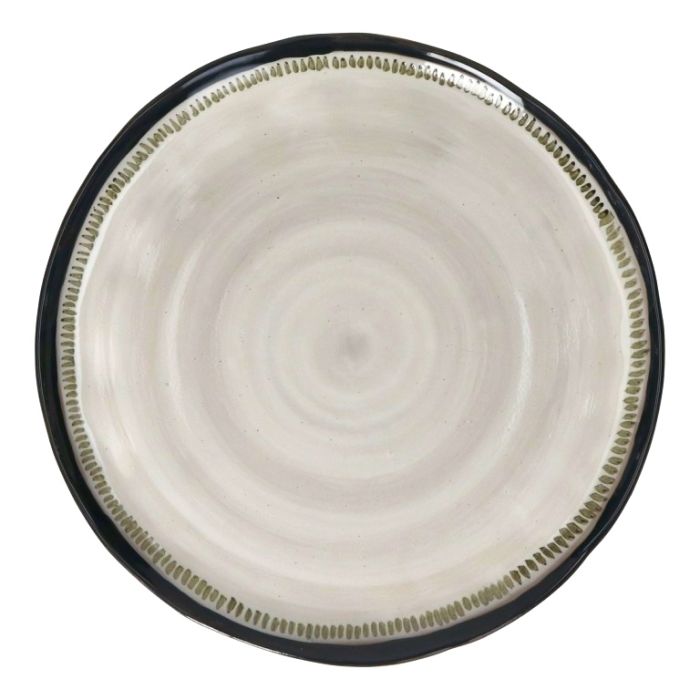 Het dinerbord uit de Cycle-collectie van Pomax combineert natuurlijke verfijning met een tijdloze uitstraling. De warme, bruine onderzijde contrasteert prachtig met het zacht glanzende, crèmekleurige oppervlak, omlijst door een donkergrijze rand met handgeschilderde penseelstreken. De subtiel onregelmatige vorm en het organische glazuur geven elk bord een uniek, ambachtelijk karakter dat rust en harmonie op tafel brengt.