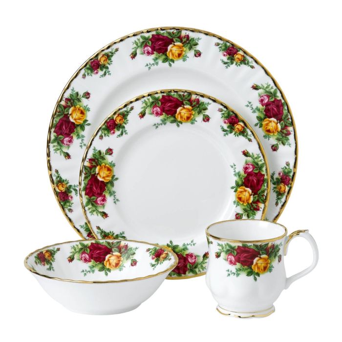 Old Country Roses: het meest succesvolle servies van Royal Albert. Wereldwijd het meest verkocht en een al lang bestaand bewijs van tijdloze stijl en elegant vakmanschap. Deze 4-delige dinerset is versierd met het kenmerkende Old Country Roses-motief van bordeauxrode, roze en gele rozen, geaccentueerd met glanzende gouden randjes van echt bladgoud. Leuk voor ontbtijt of lunch en de borden kunt u natuurlijk ook gebruiken voor diner.