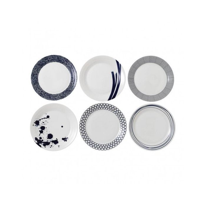 Met deze set van zes dinerborden uit de Pacific-collectie van Royal Doulton kleed je de tafel op een stijlvolle en speelse manier aan. De collectie, geïnspireerd door de oceaan, combineert fris wit met diepblauwe tinten en opvallende grafische patronen (Dot, Lines, Circle, Splash, Texture, Brush). Elk bord in de set heeft een uniek ontwerp, wat samen zorgt voor een harmonieus geheel dat zowel tijdloos als modern aanvoelt. De hoogwaardige afwerking en het kenmerkende Delft-blauw maken deze borden tot een bijzondere toevoeging aan je serviescollectie.