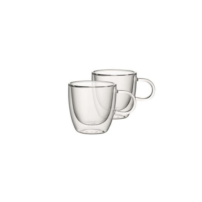 Met de kleine, dubbelwandige kopjes voor twee blijft espresso langer warm.