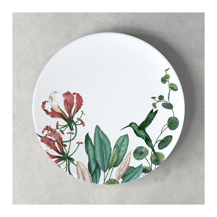 Het dinerbord uit de collectie Avarua met zijn botanische motieven en zachte kleuren laat u genieten van uw favoriete eten terwijl u wegdroomt van een paradijselijk oord als de Cookeilanden. Laat u meevoeren naar een wereld van paradijsvogels en exotische planten