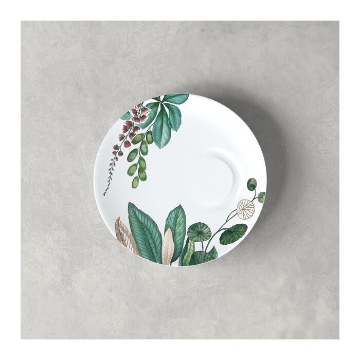 Het espresso-schoteltje uit de collectie Avarua met zijn botanische motieven en zachte kleuren past perfect bij het Avarua espressokopje en laat u genieten van uw favoriete warme drank terwijl u wegdroomt van een paradijselijk oord als de Cookeilanden. Laat u meevoeren naar een wereld van paradijsvogels en exotische planten