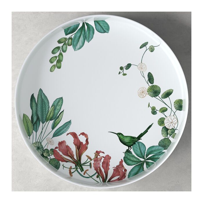 De serveer- en deco-schaal uit de collectie Avarua met zijn botanische motieven en zachte kleuren zet uw lievelingsgerechten in de schijnwerpers en doet u dromen van paradijselijke oorden zoals de Cookeilanden. Laat u meevoeren naar een wereld van paradijsvogels en exotische planten