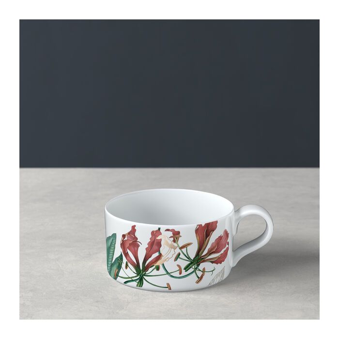 De theekop uit de collectie Avarua met zijn botanische motieven en zachte kleuren laat u genieten van uw favoriete warme drank terwijl u wegdroomt van een paradijselijk oord als de Cookeilanden. Laat u meevoeren naar een wereld van paradijsvogels en exotische planten