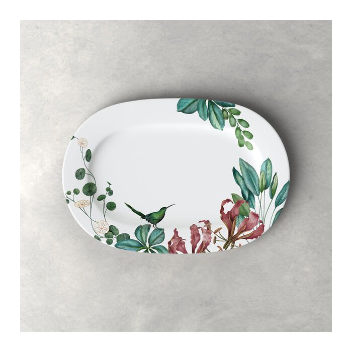 De serveerschaal met een lengte van 41 cm uit de collectie Avarua met zijn botanische motieven en zachte kleuren laat u genieten van uw favoriete eten terwijl u wegdroomt van een paradijselijk oord als de Cookeilanden.