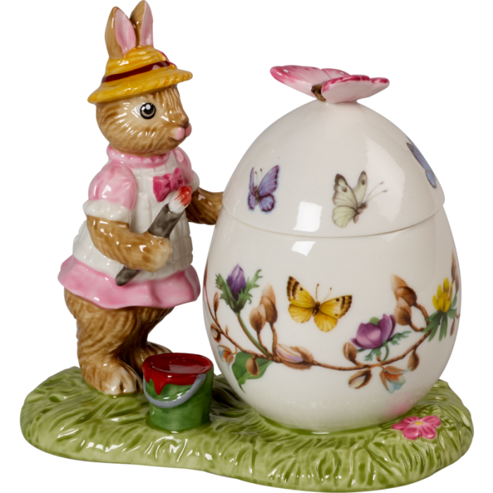 Paashaas Anna brengt de laatste penseelstreken op het grote paasei aan. Het deksel kan worden verwijderd, waardoor het ei een kleine opbergplaats voor Pasen is. Ideaal als decoratie, verzamelobject of liefdevol cadeau. Geef uw huis een prachtige paassfeer.