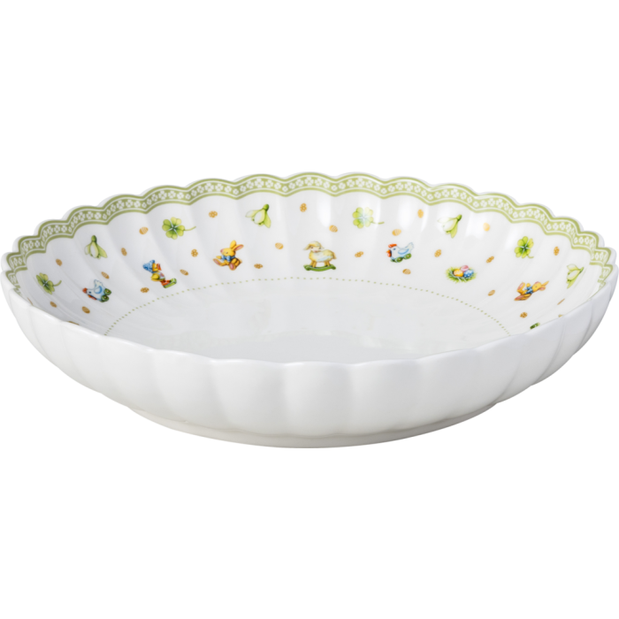 Vier Pasen in stijl met dit diepe bord uit de Easter Delight collectie van Villeroy & Boch. Dit bord, met een diameter van 24 cm, is vervaardigd uit hoogwaardig premium porselein en toont een betoverend patroon van vrolijke lentemotieven – van kuikentjes en lammetjes tot klavertjes en bloemetjes. De sierlijke golfrand en zachte groentinten geven het geheel een frisse, speelse uitstraling.