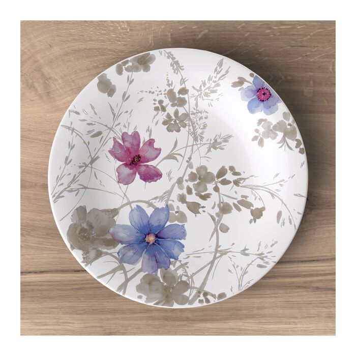 De subtiele kleuren van Mariefleur Gris creëren een zee van bloemen in blauw en grijs op uw tafel. De elegant gebogen vormen van het porselein maken het bereiden en serveren van uw gerechten nog mooier. Het ontbijtbord onderscheidt zich door veelzijdigheid: 's morgens bij het ontbijt, ’s middags voor het serveren van heerlijke taarten of voor snacks 's avonds, het bord vergezelt u de gehele dag. Verwen uw geliefden met hoogwaardig serviesgoed.