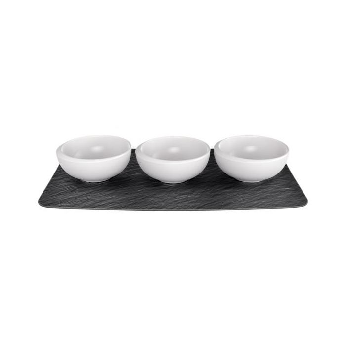 De set bestaat uit drie dipschaaltjes en een rechthoekig bord in leisteen-look uit de serie Manfucture Rock.