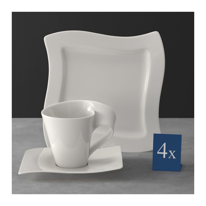 De collectie NewWave overtuigt door asymmetrische vormen en gebogen lijnen. Het tot «trendy servies van het jaar» uitgeroepen decor is een echte bestseller en vormt een blikvanger voor de gedekte tafel. Deze set bevat elk 4 koffiekopjes en bijpassende schotels plus borden voor lekker gebak bij de koffie. Zo beschikt u over alles om gezellig koffie te drinken met vrienden en familie. Geniet van het koffiedrinken met een bijzondere sfeer. Set bestaat uit: