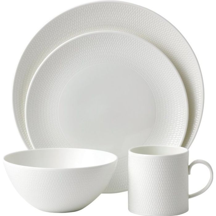 Geef je eettafel een moderne en stijlvolle basis met deze Wedgwood16-delige serviesset uit de iconische Gio-serie. Deze complete set bestaat uit vier dinerborden (28 cm), vier ontbijtborden (23 cm), vier ontbijtschalen en vier mokken. Het servies is gemaakt van hoogwaardig Fine Bone China porselein en voorzien van een verfijnd, geometrisch reliëf dat de set een eigentijdse, minimalistische uitstraling geeft.
