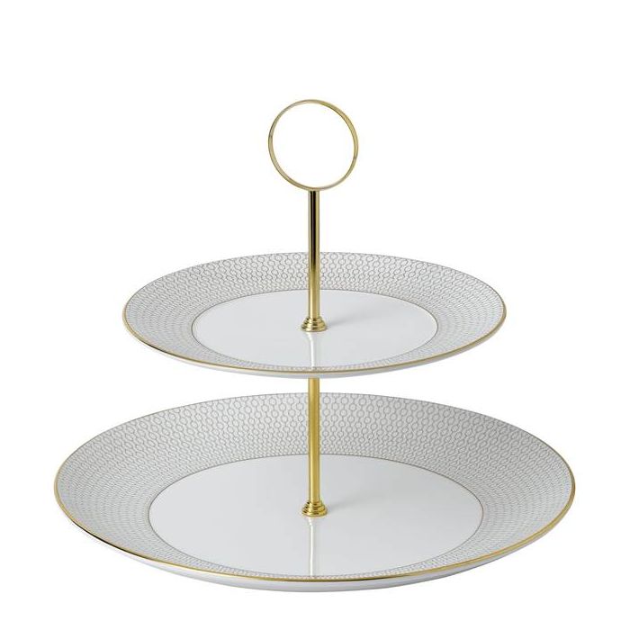 Maak van elk theemoment een luxe gelegenheid met deze verfijnde étagère uit de Gio Gold-collectie van Wedgwood. De twee lagen van helder wit bone china zijn subtiel omlijst met een geometrisch patroon in 22-karaats goud, wat zorgt voor een geraffineerde en moderne uitstraling. De gouden handgreep en sierlijke belijning benadrukken de elegante vormen en maken van deze etagère een echte blikvanger op tafel.