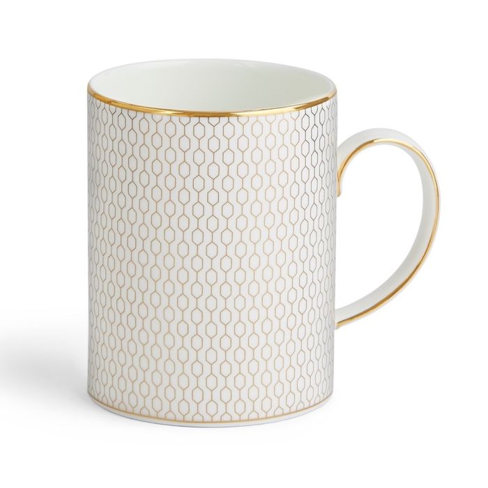 Begin je dag in stijl met de Gio Gold mok van Wedgwood – een verfijnd samenspel van modern design en tijdloze elegantie. Deze porseleinen mok is uitgevoerd in stralend wit bone china en subtiel versierd met een geometrisch patroon van 22-karaats goud. De glanzende gouden accenten op de rand en het elegant gebogen oor geven het geheel een luxe uitstraling die perfect past bij zowel een rustig ontbijt als een feestelijk koffiemoment.