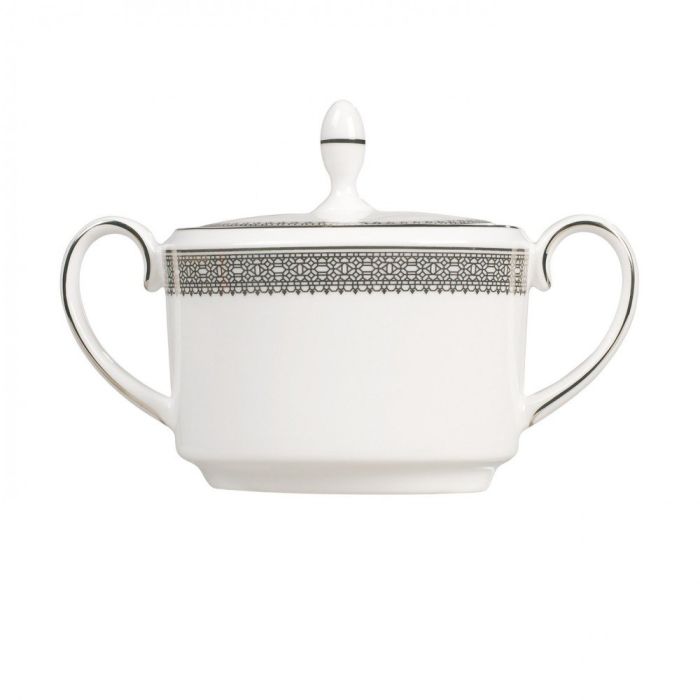 Suikerpot met deksel uit de Vera Wang Lace Platinum serie van Wedgwood.