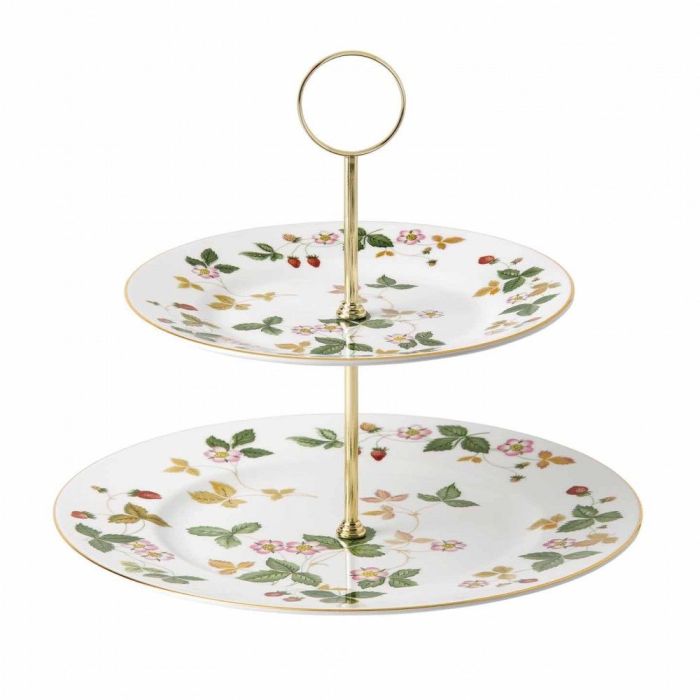 Deze tweelaags etagère uit de Wedgwood Wild Strawberry collectie is een elegante blikvanger voor elke gelegenheid. Versierd met het iconische aardbeienmotief, bloesems en blaadjes, en afgewerkt met subtiele 22-karaats gouden accenten, is deze etagère ideaal voor een stijlvolle high tea, brunch of feestelijk dessertbuffet. De combinatie van het romantische design en het glanzende goud maakt dit stuk tot een waar pronkstuk op tafel.